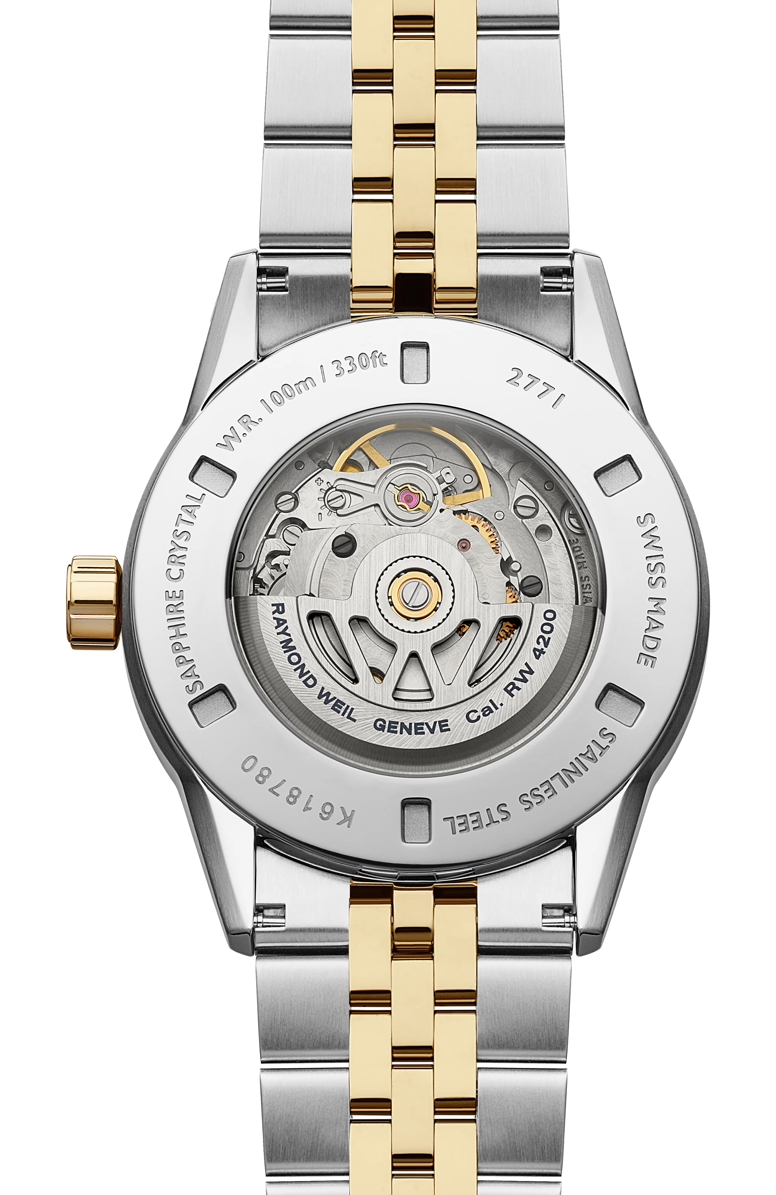 Equipped with an automatic winding movement housed in a 38 mm case, this timepiece features a captivating and elegant sunrayed blue dial with a date function at 3 o’clock. The two-tone stainless steel bracelet is equipped with a double-push security system folding clasp and the screw down crown is embossed with the RW monogram for a touch of refinement. The decorated Swiss-made automatic movement can be seen through the transparent sapphire crystal case back. Perfect balance of tradition and modernity, the freelancer automatic collection showcases RAYMOND WEIL’s unwavering dedication to craftsmanship and artistic expression. Launched in 2007, the freelancer collection was created in honor of the free-spirit who wishes to remain in control of there own destiny, and features an eclectic mix of urbane mechanical watches. This freelancer mixes classic and modest to create a harmonious and unique design. Constantly reinterpreting itself and free from all constraints, the freelancer conserves those elements which constitute its strengths.