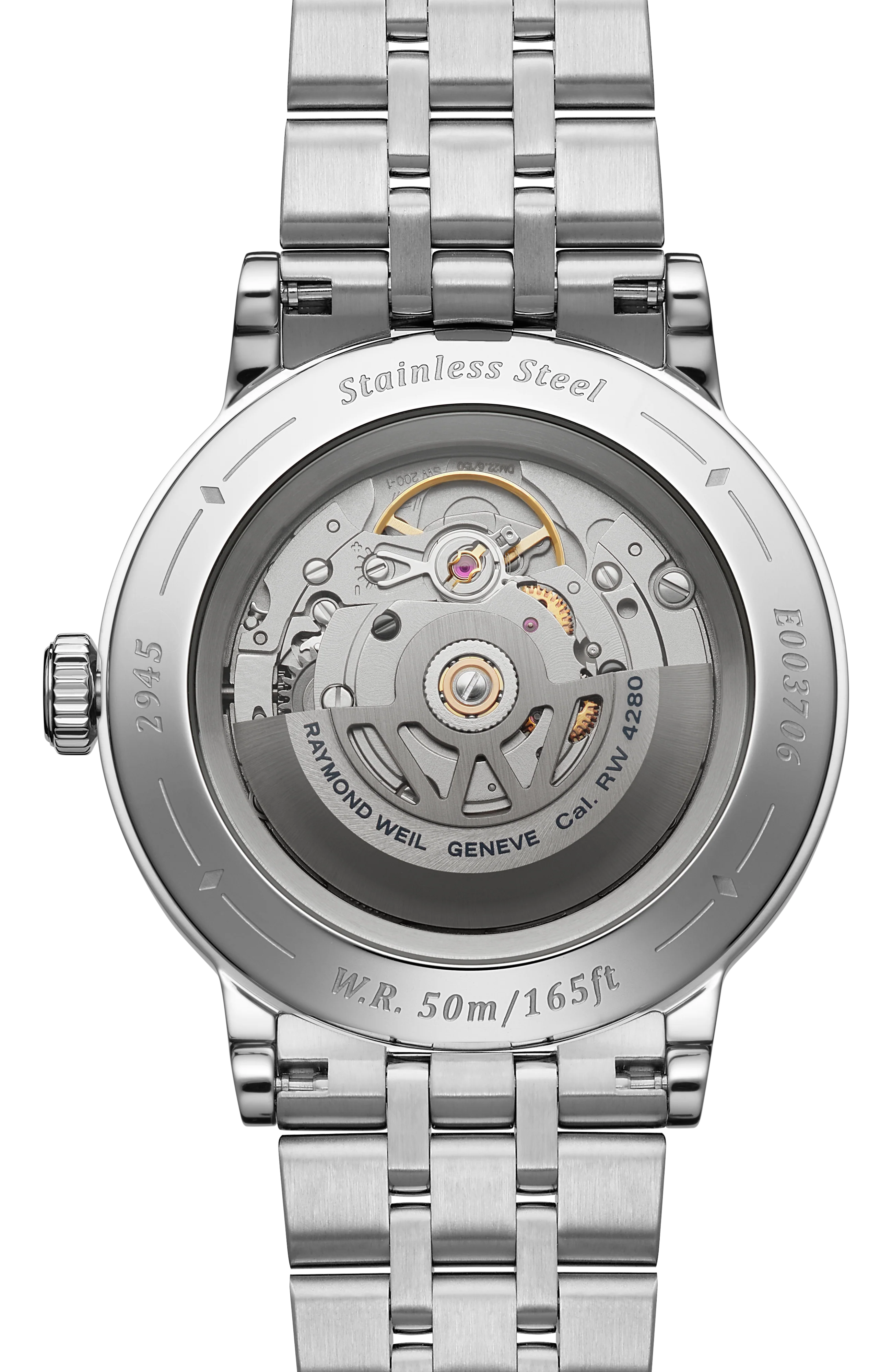 The bezel is decorated with a vertical satin-brush that contrasts wonderfully with the highly polished bevel nearby. This juxtaposition of two finishes reinforces the overall level of finishing. A sapphire caseback affords sight of the self-winding movement within and the “W-shaped” oscillating weight, RAYMOND WEIL’s horological signature.This Millesime is enhanced with a stainless steel bracelet.