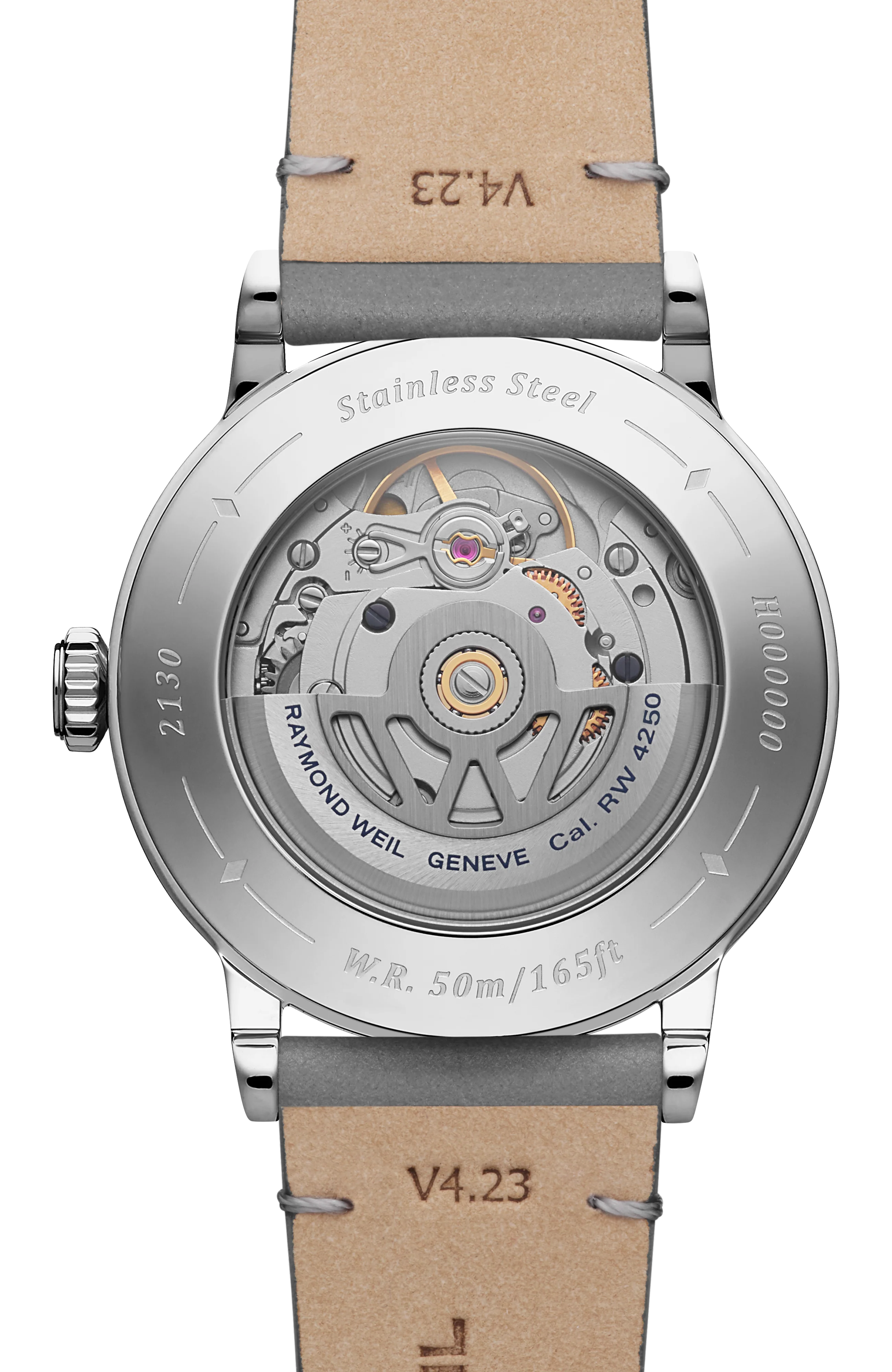 A sapphire caseback affords sight of the self-winding movement within and the âW-shapedâ oscillating weight, RAYMOND WEILâs horological signature. The grey genuine calf leather strap is enhanced with a unique W-stitched detail.