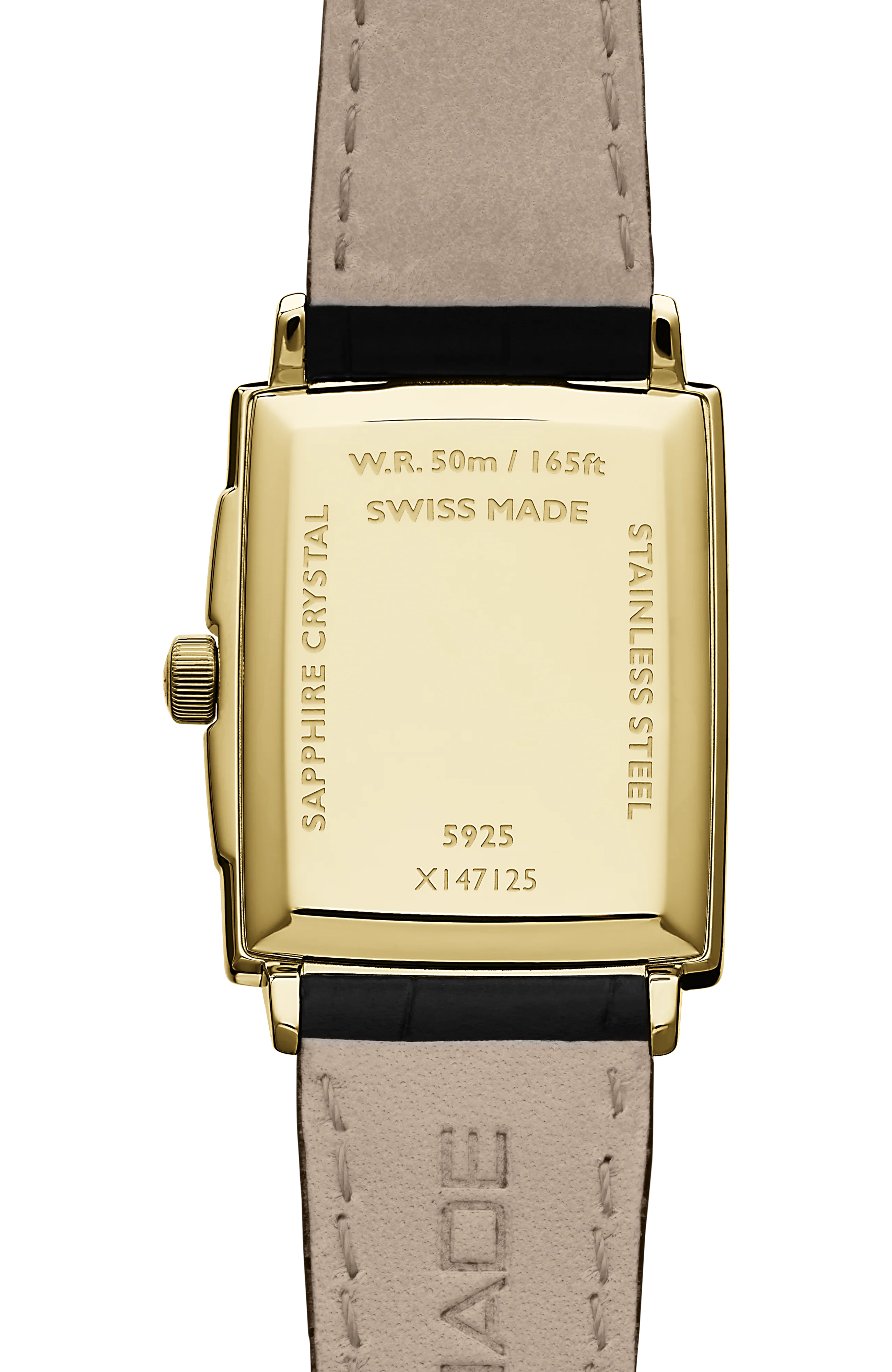 This new quartz model adopts a sophisticated art deco appeal with an elongated rectangular face and slim 6.25 mm case. This is our shallowest case design to date which gives a very sleek profile to this watch. This timepiece of choice is available in several variations. The face comes in combinations of black roman numerals on a crisp white dial or alternating gold & diamond indexes on a mother-of-pearl face.The sapphire crystal window is framed by a beveled rectangular case. The tiered design gives this watch an illusion of depth without the thickness. The watch is completed with RW monogram signature upon the crown.