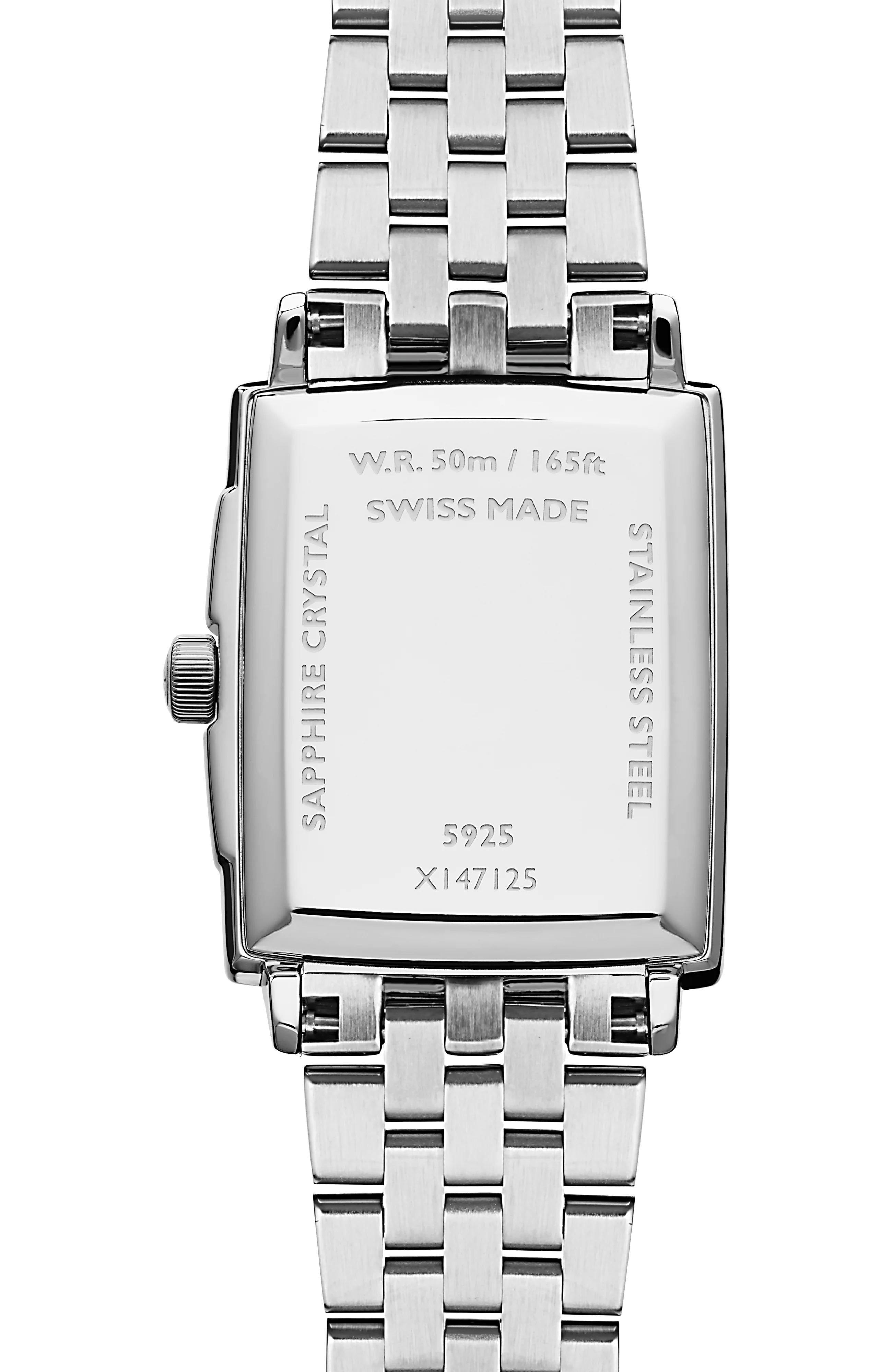 The sapphire crystal window is framed by a beveled rectangular case. The tiered design gives this watch an illusion of depth without the thickness. The watch is completed with RW logo signature upon the crown.